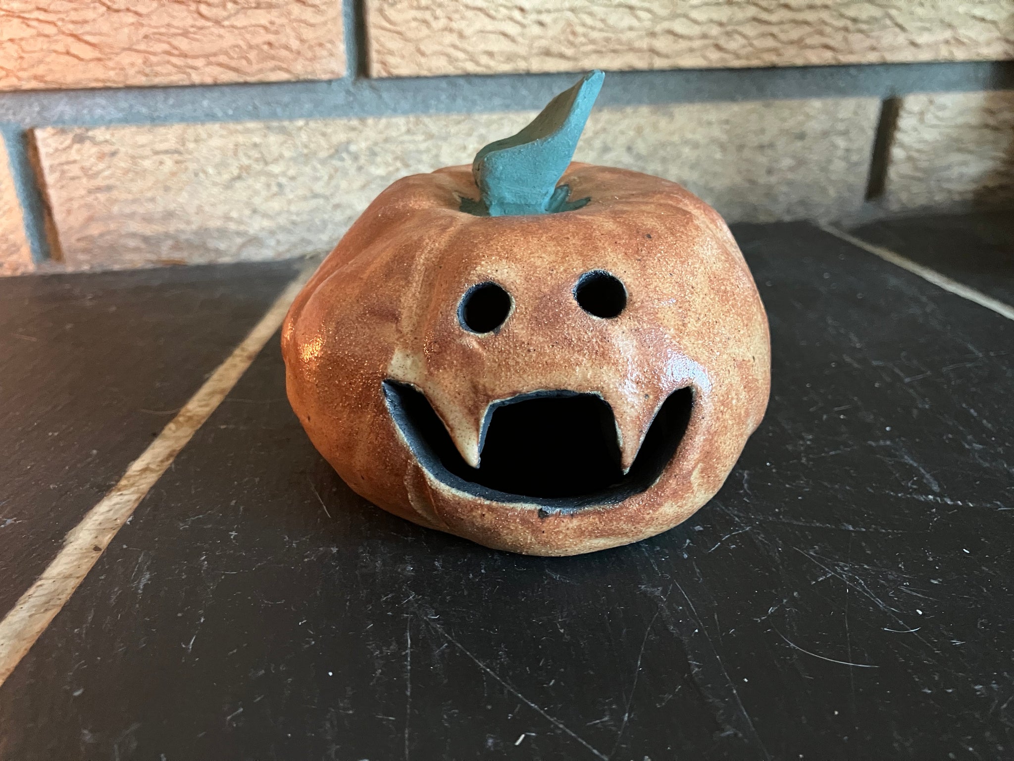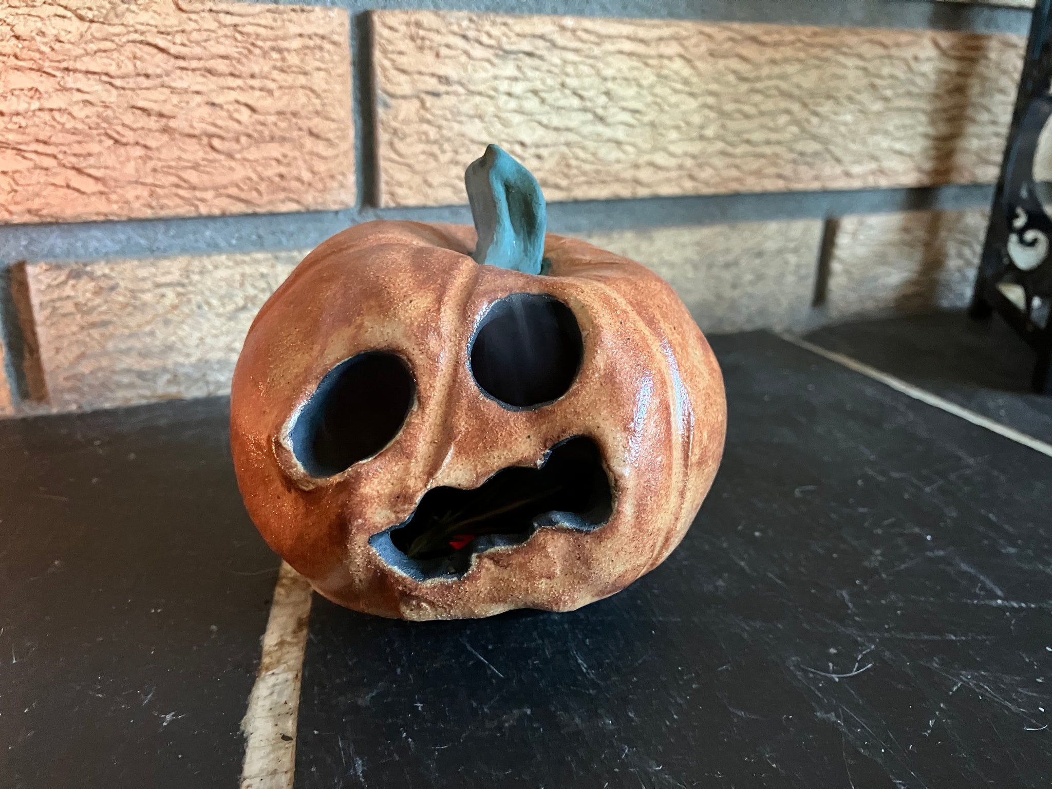 Looking for a pumpkin that wont rot after Halloween? How about one of these sweet little hand sculpted ceramic pumpkins. Much like real pumpkins these sculptures are all slightly different, in size, shape, and face. Each Jack - O - lantern is big enough to put a cone incense or tea light candle under.